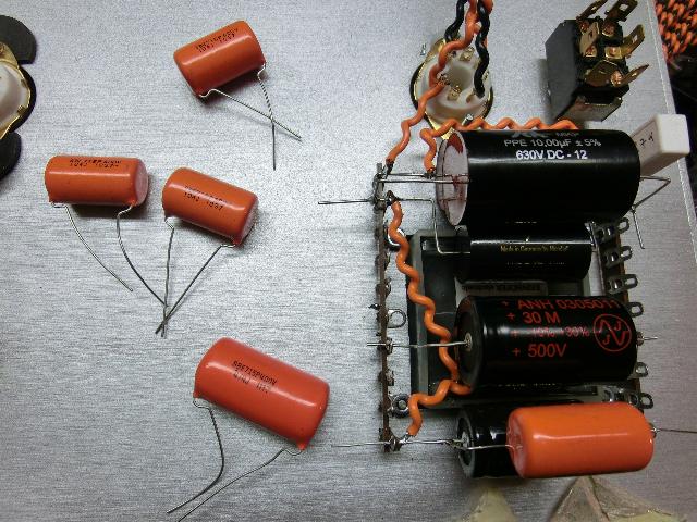 Der Audiopart ist fast fertig. Auch der Kathodenkondensator der 6SN/GTB Treiberröhre hat noch einen "Orange Drop" spendiert bekommen