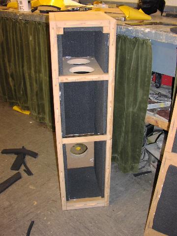Hier ein fertig verleimtes Hochtongehäuse. Dieses sitzt später schwimmend gelagert auf dem unteren Tief/Mitteltongehäuse. Somit wird die Übertragung von restlichen Resonanzen auf den Hochtöner gemindert bzw. unterdrückt.