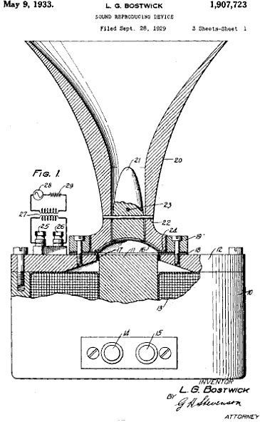 Western Electric 597a Loud Speaking Telephone: Der erste Hochtöner der Welt Im September 1929 des letzten Jahrhunderts wurde von Lee G. Bostwick unter der Bell Telephone Inc. der Patentantrag http://www.google.co.in/patents/US1907723 unter anderem für den später von Western Electric eingesetzten Hochtöner 597a eingereicht. Er sollte in den alten Kino- bzw. Theatersystemen dazu genutzt werden, die Übertragung des Filmtones zu höheren Frequenzen hin zu erweitern.